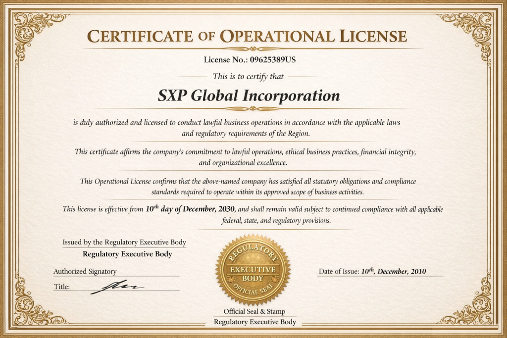 At SXP Global Incorporation, we operate with full regulatory compliance and a strong commitment to professional excellence. Our organization is officially licensed and recognized under internationally accepted operational standards, demonstrating our credibility, transparency, and dedication to ethical business practices.